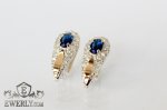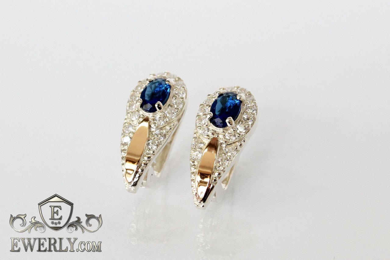 Женские серебряные серьги в виде капли, серебро 925 пробы с золотом 375 пробы и синими камнями - фианитами.
