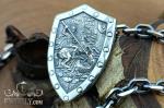 Стильный серебряный набор, включающий подвеску в форме щита с Георгием Победоносцем и мужскую якорную цепочку. Центральный элемент — рельефная подвеска с детализированным сюжетом победы над драконом. Фактура дерева, объемные заклепки и выразительная композиция создают эффект исторического артефакта и подчеркивают символику защиты и силы.