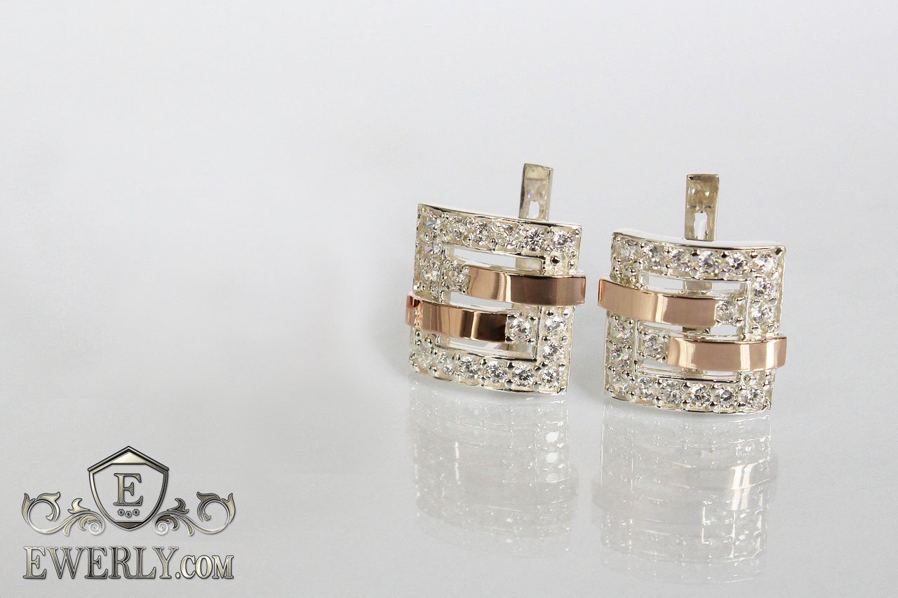 Широкие женские серьги из серебра 925 пробы с золотыми вставками 375 пробы с белыми фианитами.